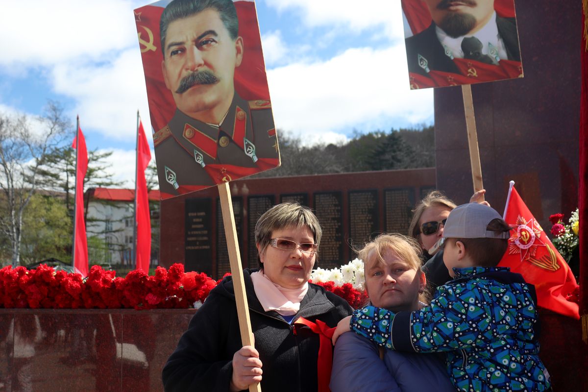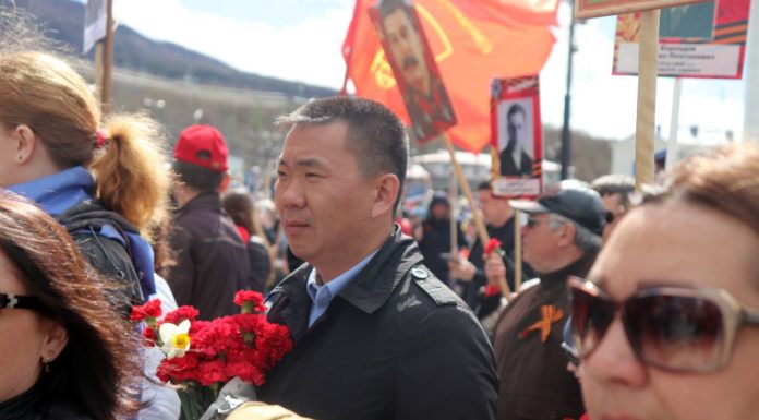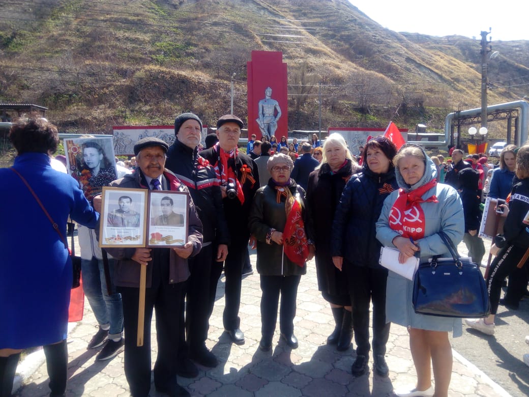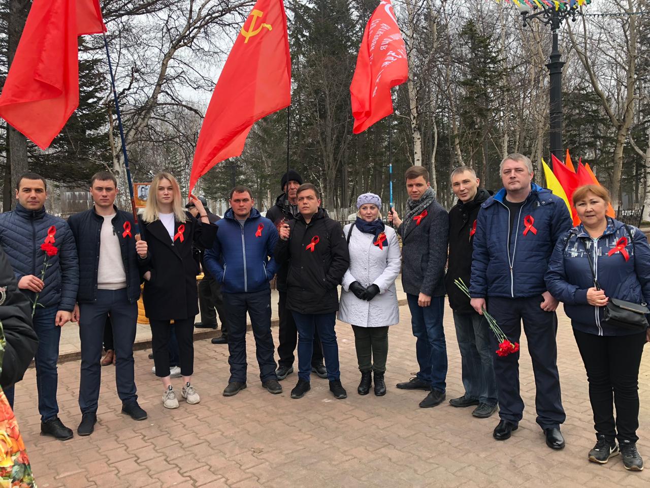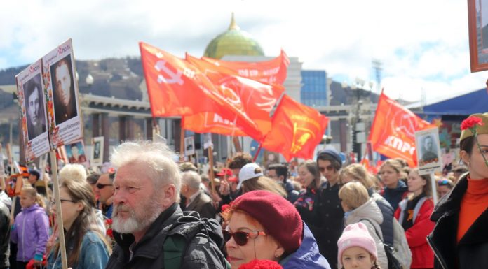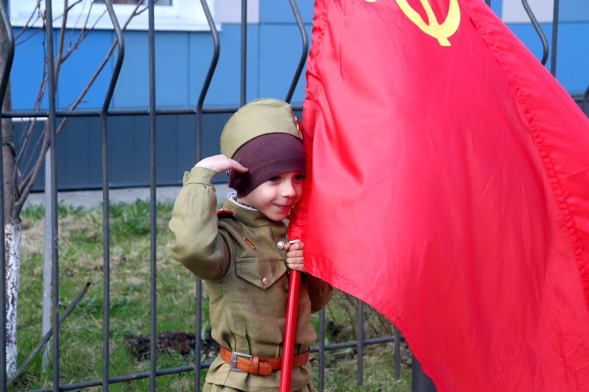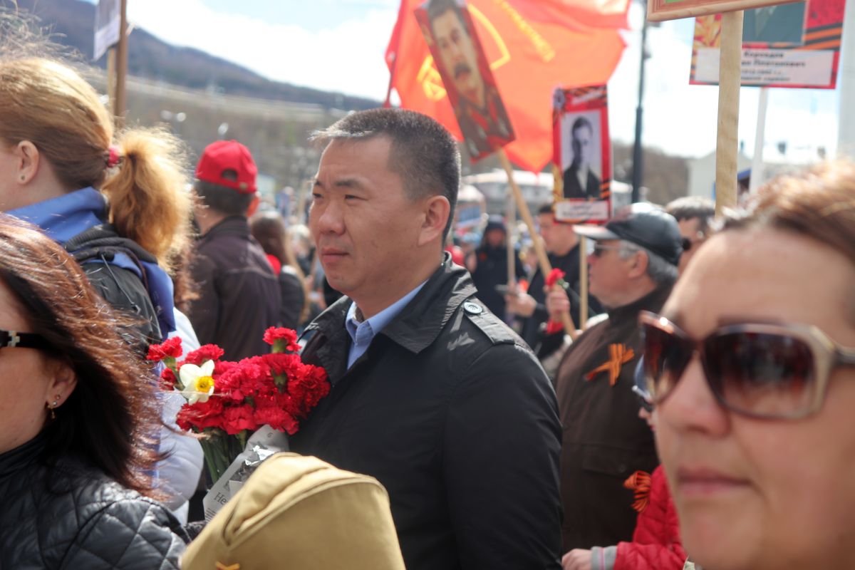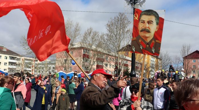 В годовщину великой Победы советского народа над нацистской Германией сахалинские коммунисты и члены ЛКСМ вышли на площадь и прошли в колонне Бессмертного полка с неизменной атрибутикой – Красным флагом победителей, портретами генералисимуса Иосифа Сталина и вождем мирового пролетариата Владимира Ленина.