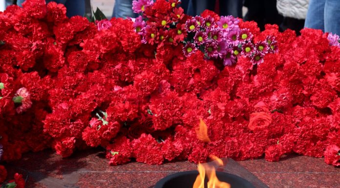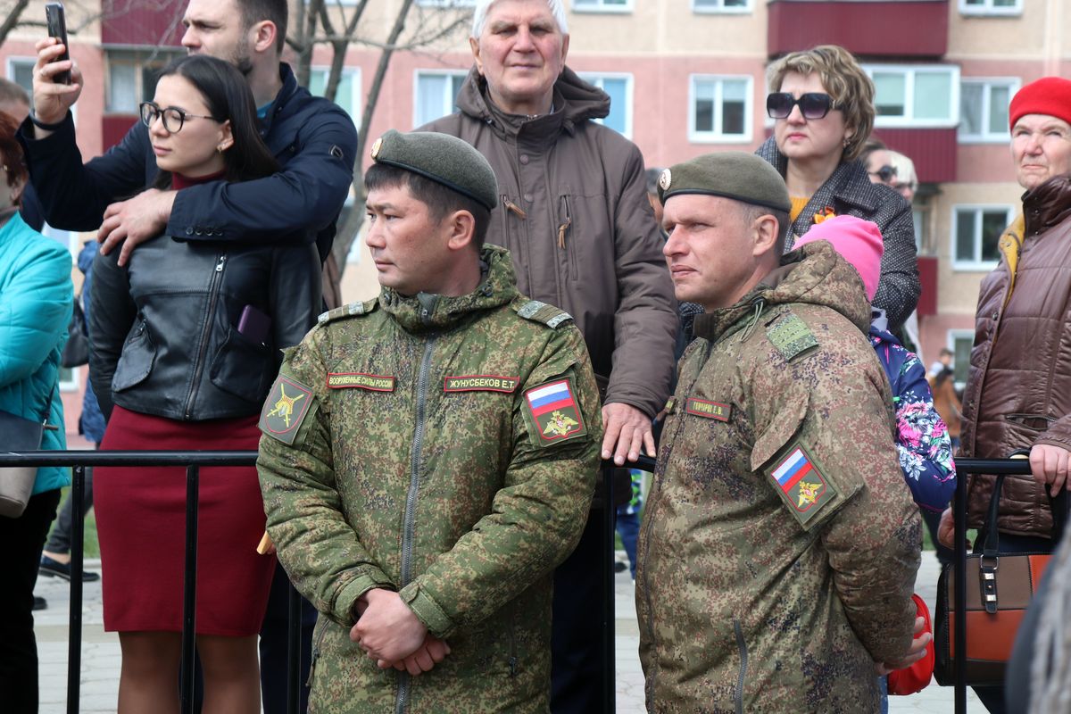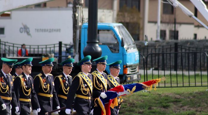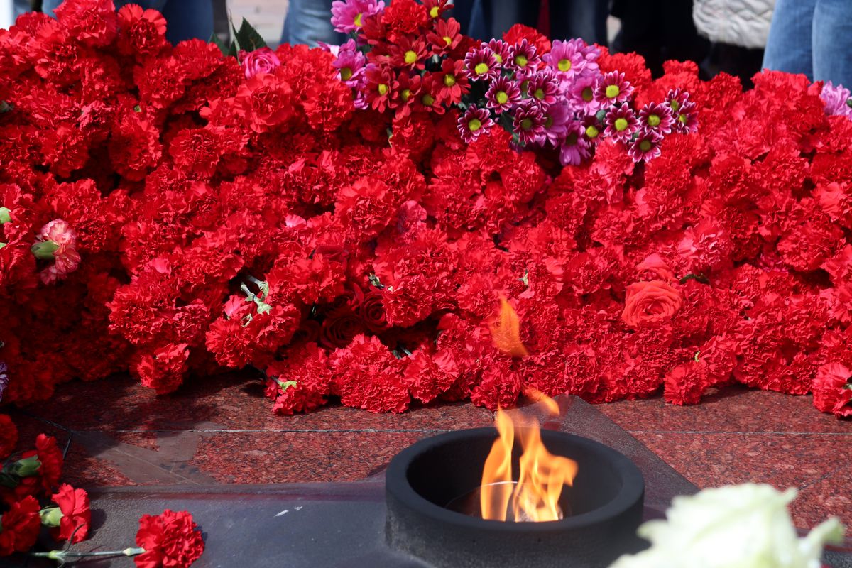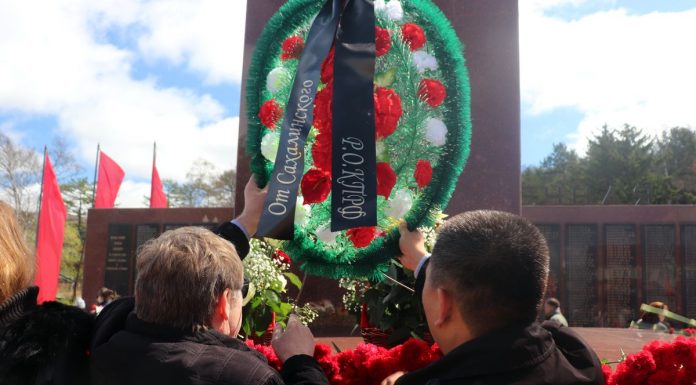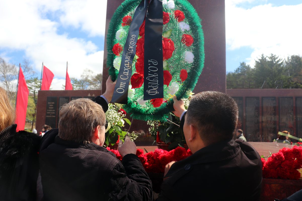 Праздничное шествие завершилось возложением памятного венка и цветов у подножия Мемориала в честь воинов, павших в боях за освобождение юга Сахалина и Курильских островов.