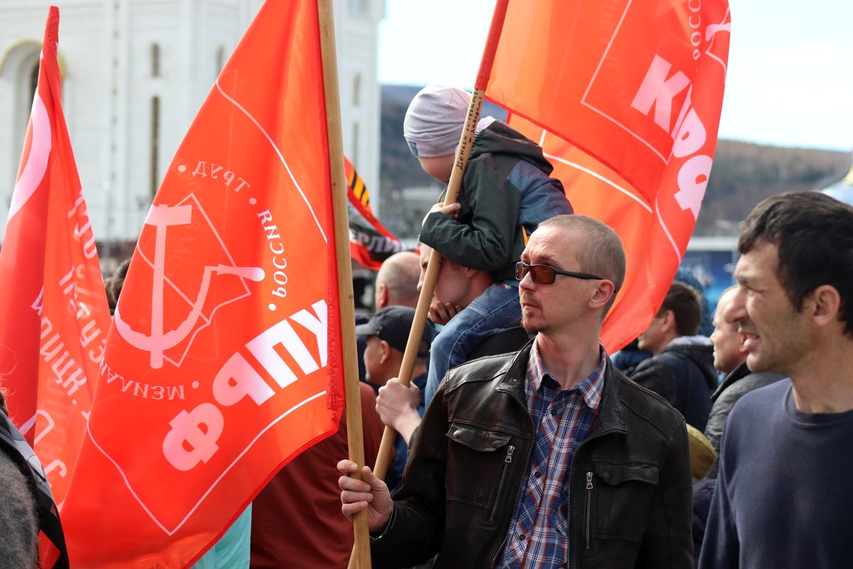 Колонну коммунистов возглавили: Первый секретарь южносахалинского отделения Юрий Белоусов и руководитель орготдела областного комитета Вячеслав Ким.