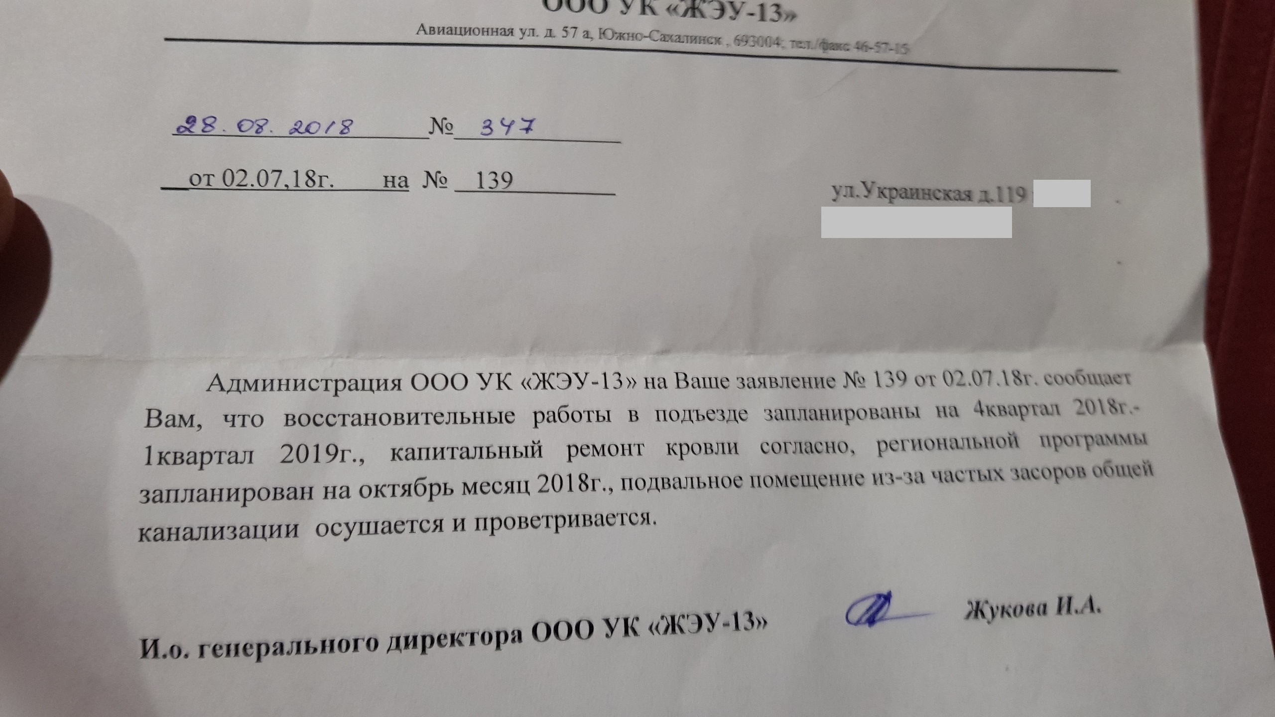 Еще в 2016 году пресс-служба администрации города Южно-Сахалинска уверенно заявляет о том, что управляющим компаниям необходимо серьезно совершенствовать качество работы и повысить ответственность перед населением. Это замечательное высказывание прибито на стены кабинетов принято сферой услуг к сведению.