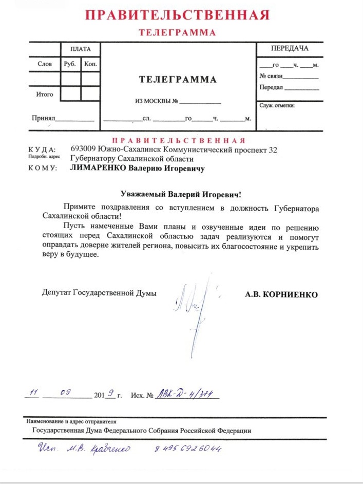Примите поздравления со вступлением в должность губернатора Сахалинской области!