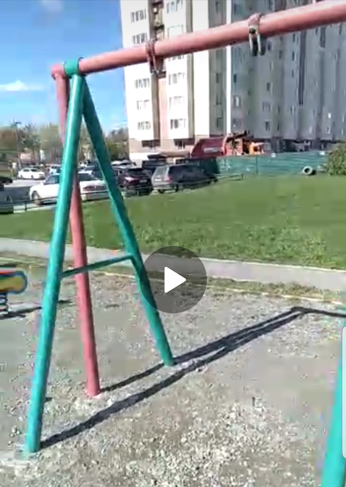 Одна из видеозаписей рассказывает о детской площадке покрытой щебнем, на котором стоят сломаные качели и песочница без песка.