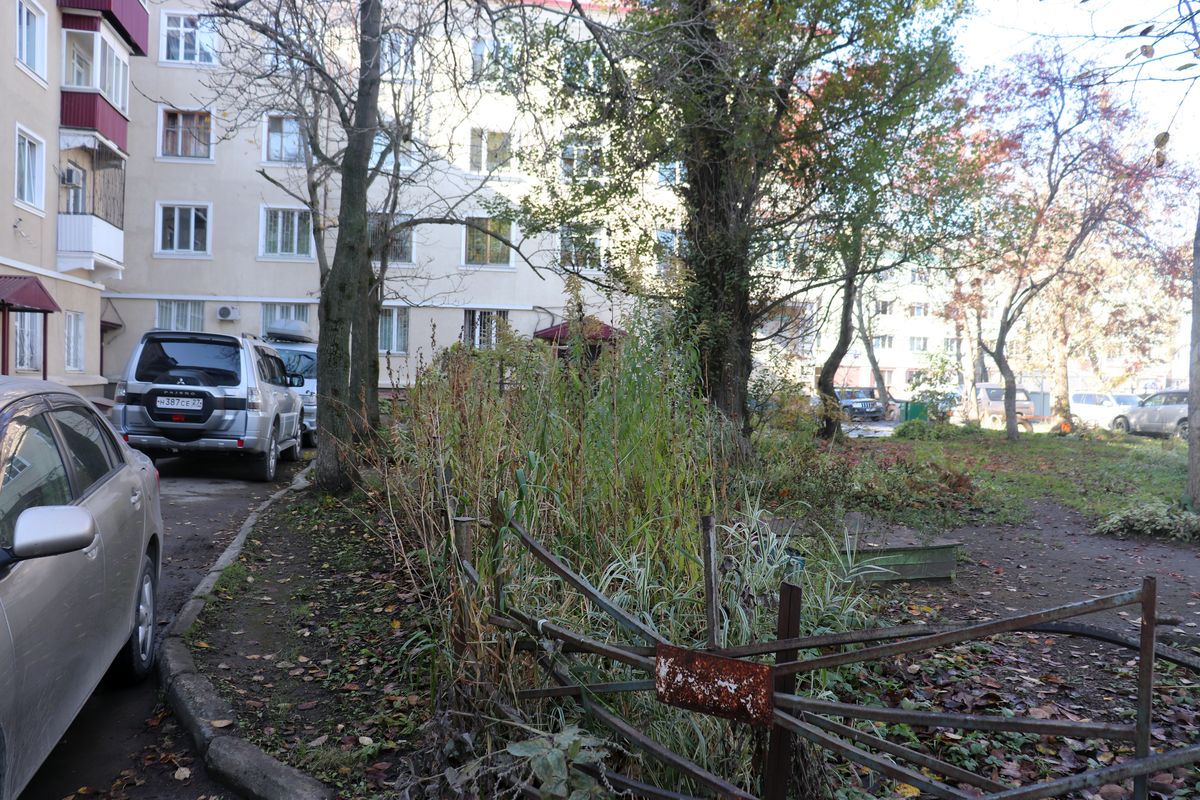 Входим во двор, в калитку дома номер 74. Картина печальная. Проезд во дворе хранит остатки асфальта, бордюры разрушились от времени, нестриженая трава, кусты.