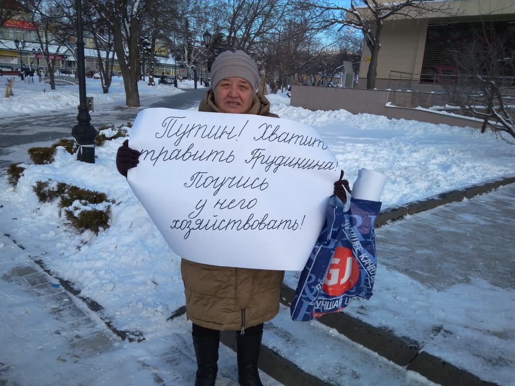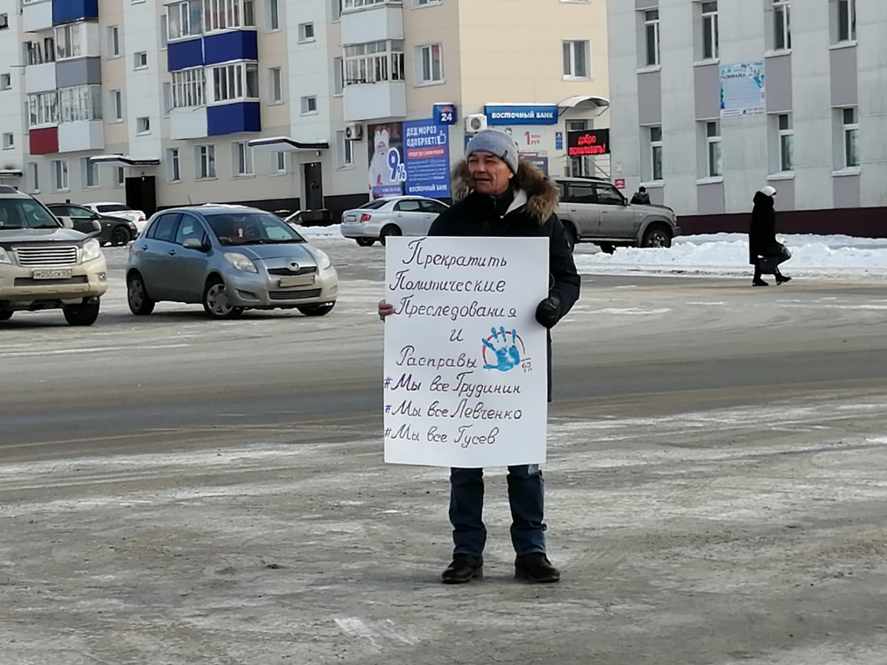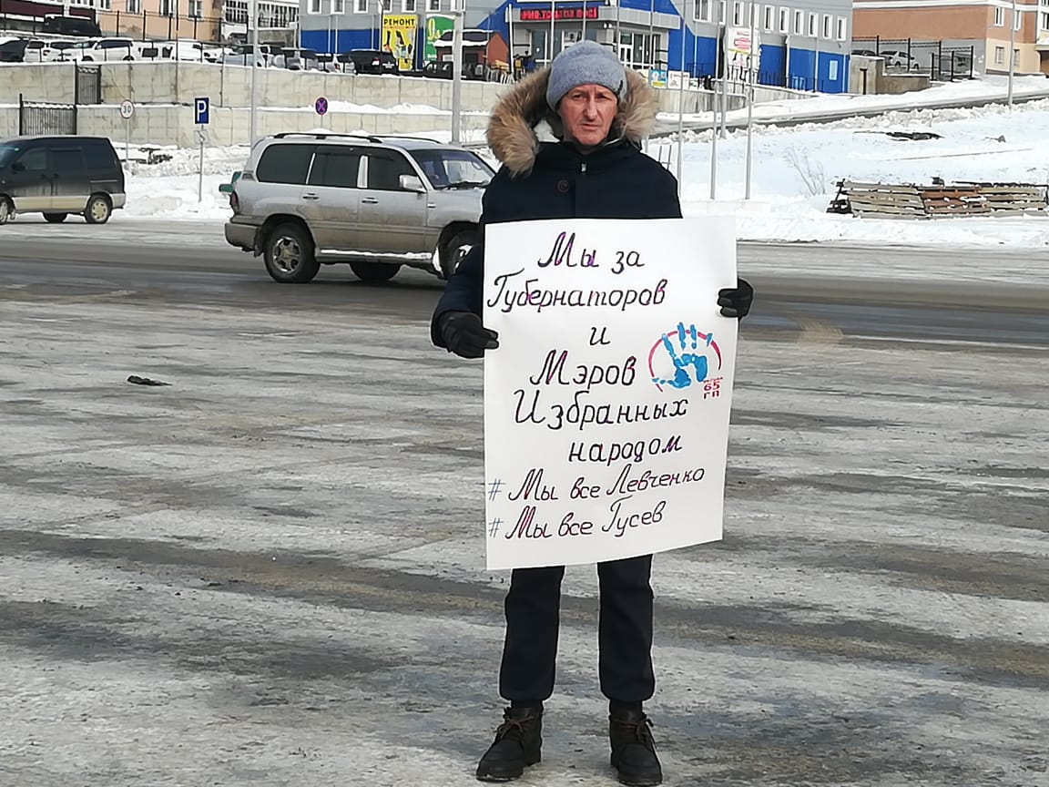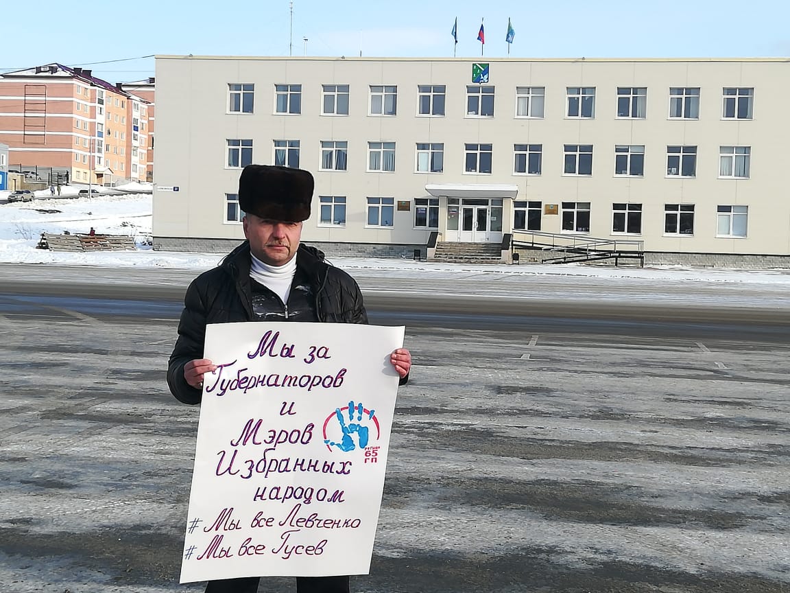 В регионе продолжается серия пикетов, участники которых выражают поддержку известным в стране руководителям: директору подмосковного совхоза Павлу Грудинину, губернатору Сергею Левченко и опальному мэру северной столицы Сахалинской области Сергею Гусеву.