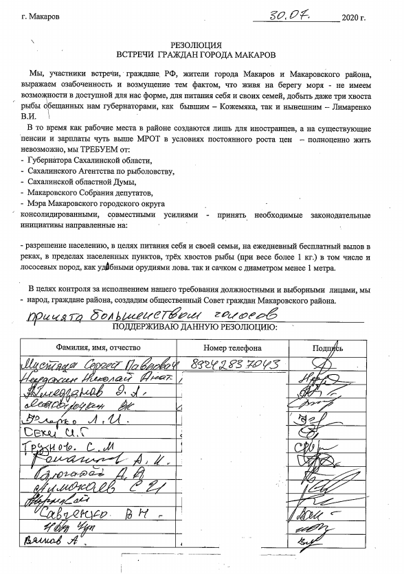 В резолюции, заверенной подписями жителей и переданной в Собрание депутатом от КПРФ Сергеем Мустяца, черным по белому вписано требование граждан к мэру и местным депутатам – «принять необходимые законодательные инициативы, направленные на: разрешение населению вылова в реке, трех хвостов рыбы, лососевых пород, для питания себя и своей семьи» обещанных нам губернаторами, как бывшим – Кожемяка, так и нынешним – Лимаренко В.И.