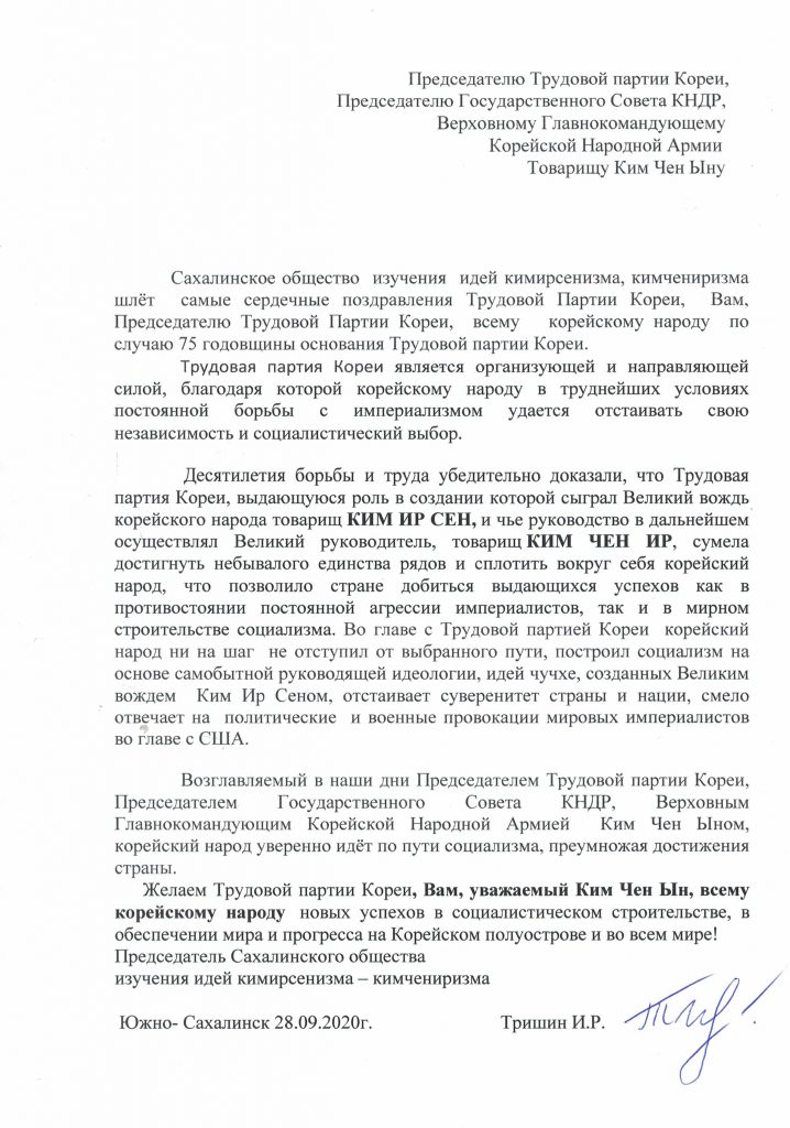 Поздравление с 75-й годовщиной основания Трудовой Партии Кореи