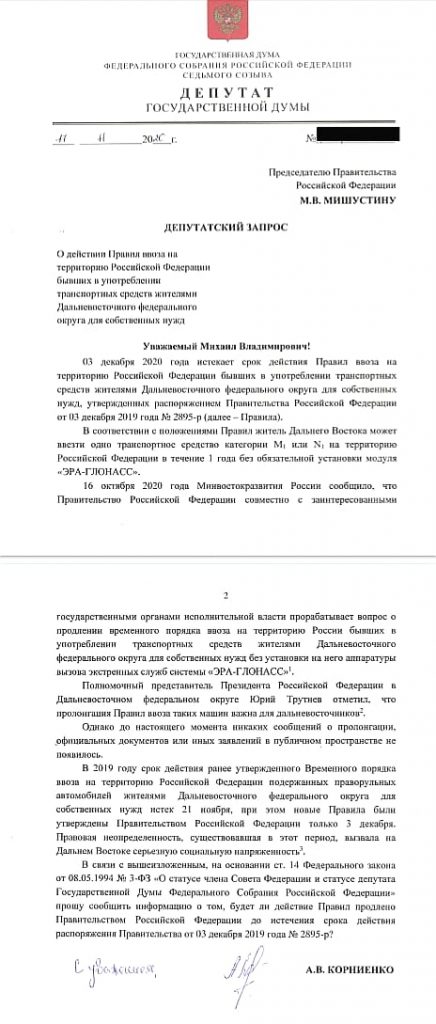 Депутат ГД от регионов Дальнего Востока (фракция КПРФ) Алексей Корниенко : Каждый год делаю запросы по поводу продления временного порядка ввоза подержанных иномарок для собственных нужд дальневосточников.