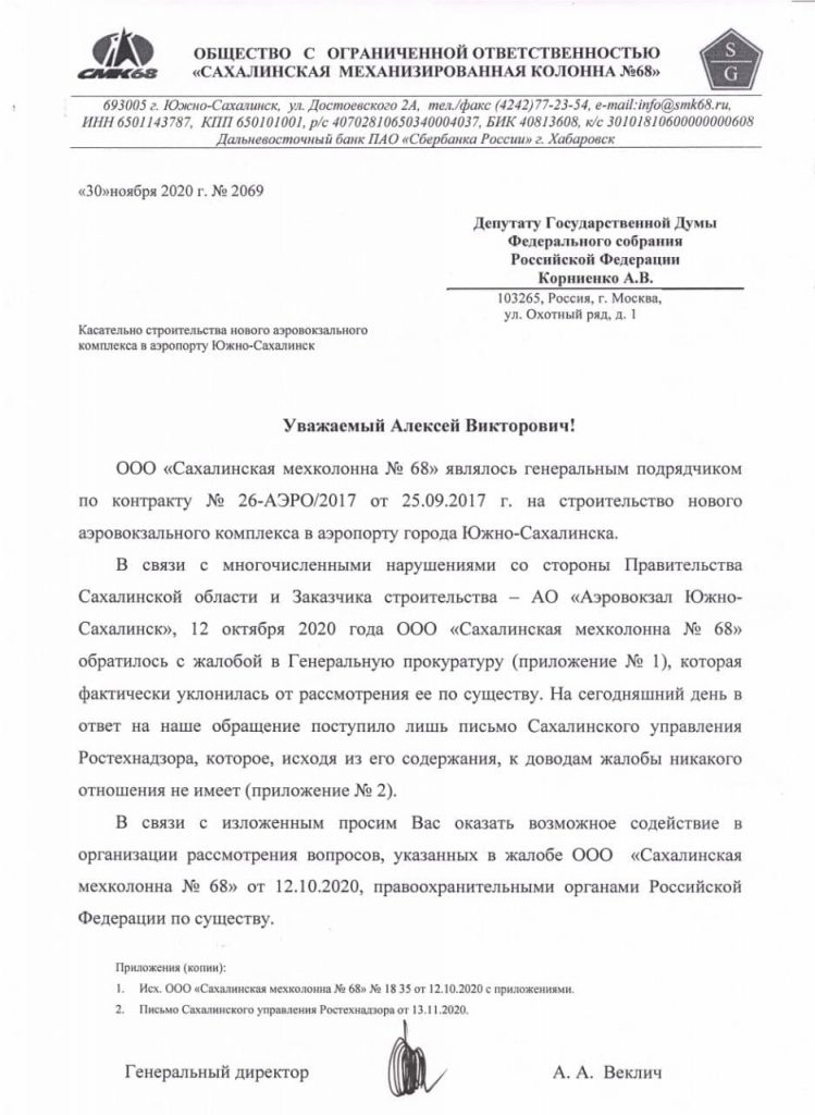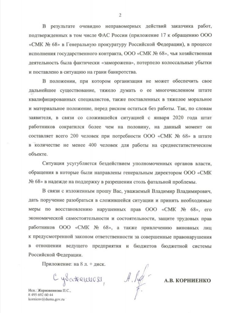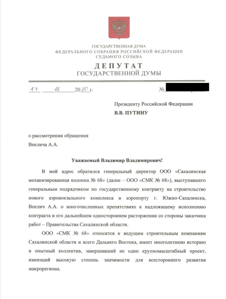 На основании просьбы руководства “Сахалинской механизированной колонны №68” , депутат ГД от регионов Дальнего Востока (фракция КПРФ) Алексей Корниенко обратился к Президенту России Владимиру Путину