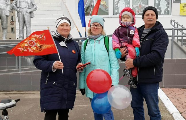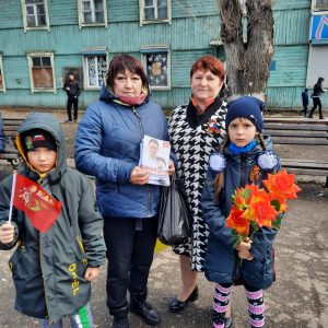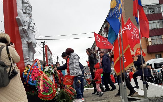 Васильев А. А., Буряковой О. В., Волков И. Ю., Тумановой В. Г., и остальные товарищи, совместно с ЛКСМ Судаковой В. В. и жителями нашего района прошли по главной улице п. Тымовское от центральной площади имени Ленина, до монумента войнам-Тымовчанам павшим в годы Великой Отечественной войны 1941-1945г.