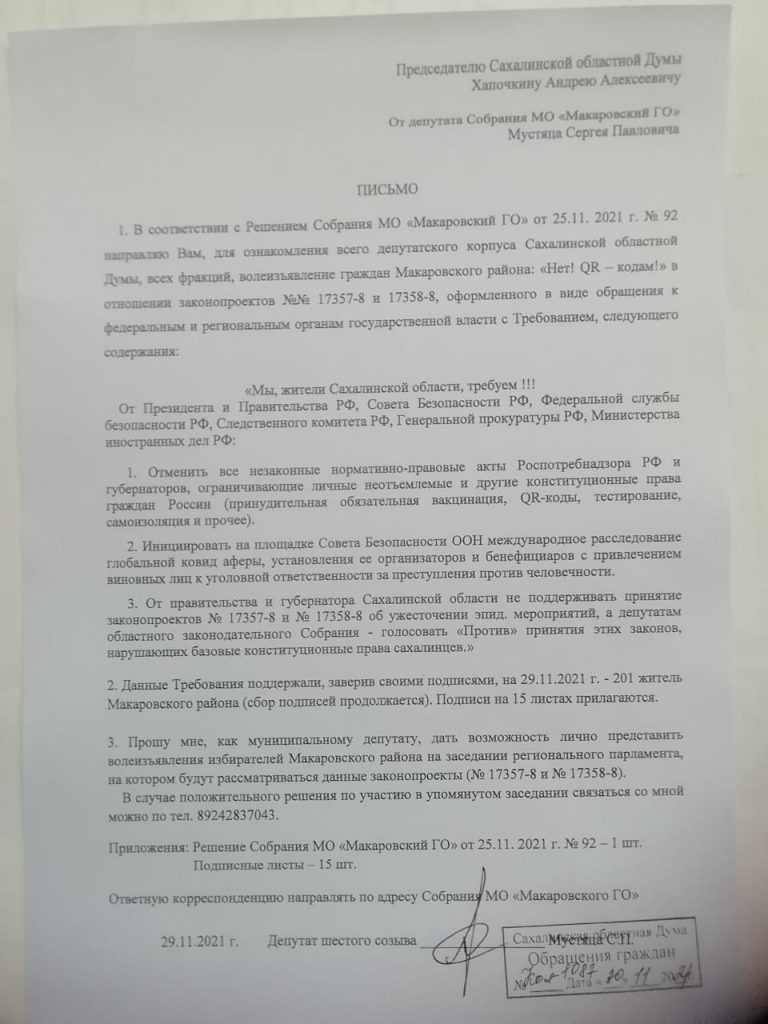 Сахалинские активисты гражданского общества из Макарова и Южно-Сахалинска подали 30 ноября 2021 г. в канцелярию областного законодательного Собрания Сахалинской области подписи граждан против введения на территории островного региона двухмерных личных меток под названием QR-коды.