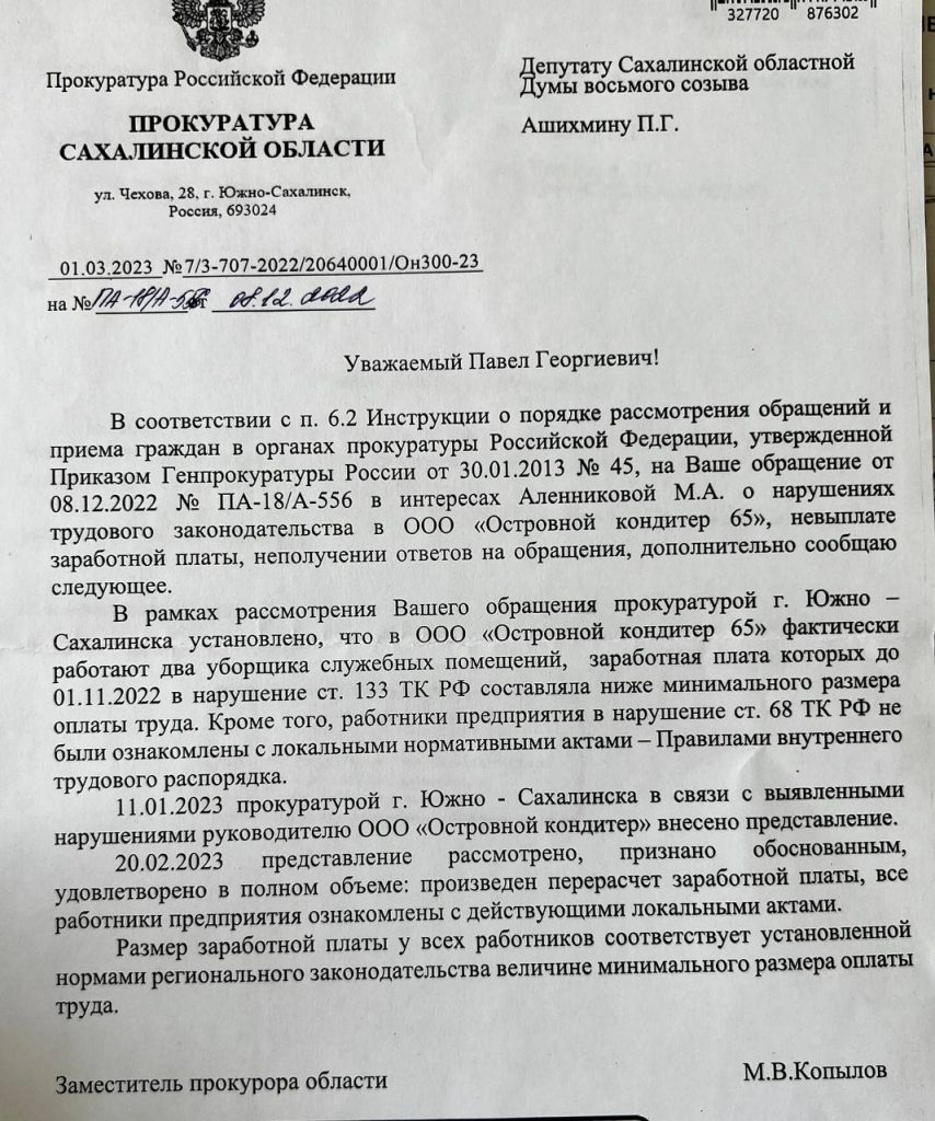 В ходе направленых запросов и тщательных разбирательств, прокуратура области выявила нарушения в деятельности руководства ООО «Островной кондитер». Работникам начисляли зарплату ниже прожиточного минимума… На данный момент работодатель обязан привести трудовые отношения в законное русло и установить размер заработной платы в соответствии с законом.