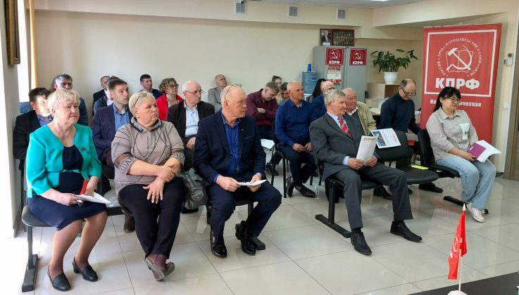 Говорили о грязных методах информационной борьбы, направленной против КПРФ и способах им противостоять. Об изменении схемы выборов в ряде городских округов – и как вести предвыборную работу в этих условиях. И… о Знамени Победы. Многих выступающих (как, к слову, и многих простых жителей области) возмутило практически полное отсутствие этого символа Великой Победы в праздничном убранстве городов. Алексей Викторович Корниенко рассказал, что в Москве Знамя Победы украшало 9 мая очень многие здания, в том числе правительственные. А на Сахалине, за редким исключением, его можно было увидеть разве что в руках людей…