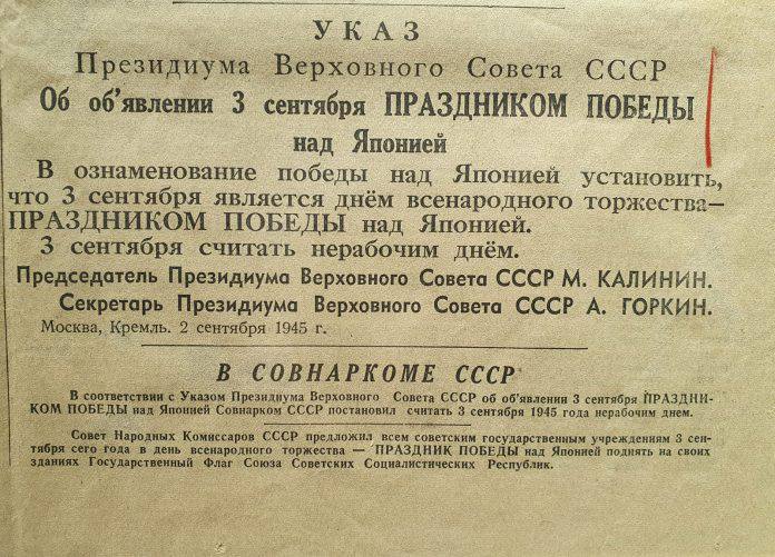 Сегодня для нас и для мировой общественности — великий день! Именно 3 сентября 1945 года Советская Армия поставила финальный аккорд во Второй мировой войне.
