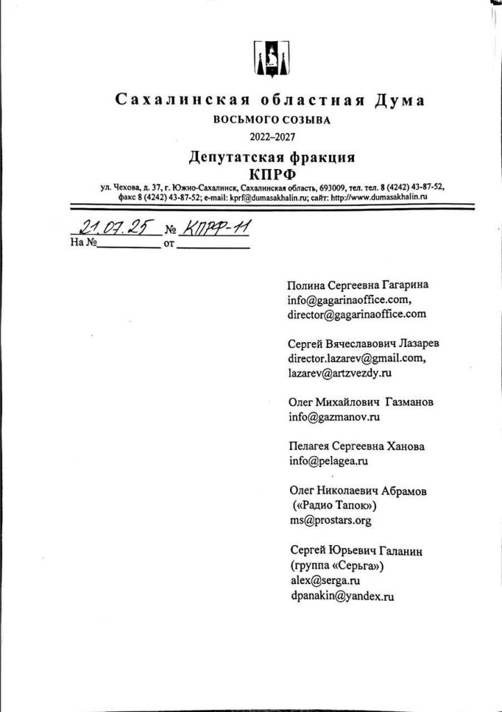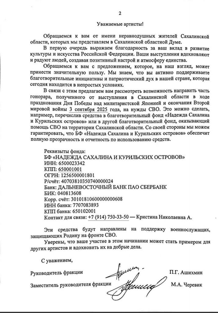Согласно решения пленума (https://t.me/kprfsakh/3096?single) депутатская фракция👍 в Сахалинской областной Думе обратилась к артистам, приглашённым на празднование 80-летия Победы над милитаристской Японией и окончания Второй мировой войны 3 сентября 2025 года, с предложением направить часть полученного гонорара на поддержку участников СВО.