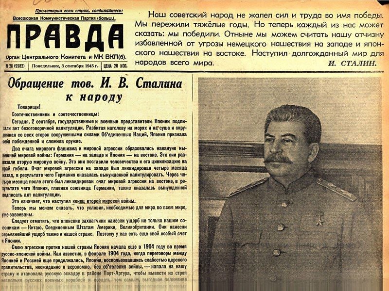 ❗️К сожалению, героизм наших предков в Русско-японской войне не смог тогда предотвратить потерю Южного Сахалина на долгие 40 лет. Лишь в 1945 году удалось вернуть Южный Сахалин и Курильские острова в состав Советского Союза. Не случайно верховный главнокомандующий товарищ Сталин в своей речи по случаю Дня победы над Японией 3го сентября 1945 говорил: “Сегодня Япония признала себя побежденной и подписала акт безоговорочной капитуляции. Это означает, что Южный Сахалин и Курильские острова отойдут Советскому Союзу… Наш народ верил и ждал, что наступит день, когда Япония будет разбита и пятно будет ликвидировано. Сорок лет ждали мы, люди старого поколения, этого дня. И вот, этот день наступил.”