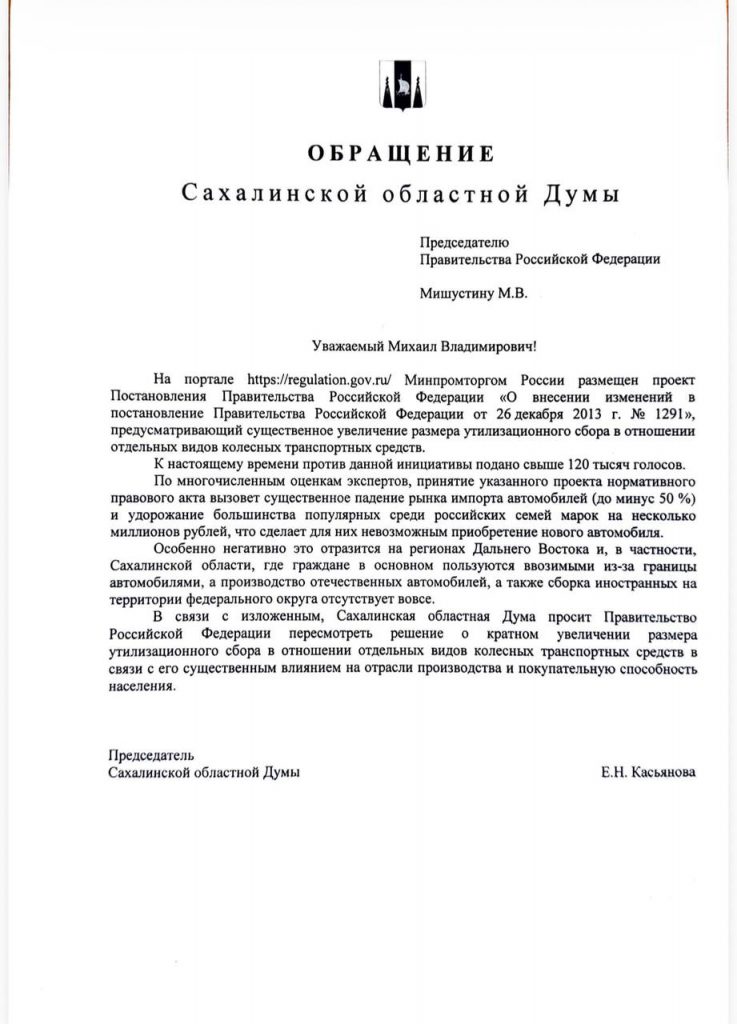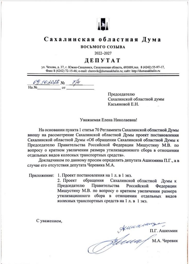 Депутаты фракции КПРФ считают важным вынести проблему утилизационного сбора на региональный уровень и надеются на конструктивное обсуждение и поддержку своей инициативы со стороны большинства депутатов Сахалинской областной Думы, в том числе, представителей фракции “Единая Россия”. Цель – обеспечить, чтобы голос жителей Сахалинской области был услышан при принятии решений, касающихся утилизационного сбора. Хотя есть опасения, что ситуация с этим обращением может повторить судьбу (https://t.me/kprfsakh/3111) июньского обращения фракции КПРФ в Правительство РФ о сохранении Александровск-Сахалинского педагогического колледжа, которое до сих пор остается нерассмотренным.