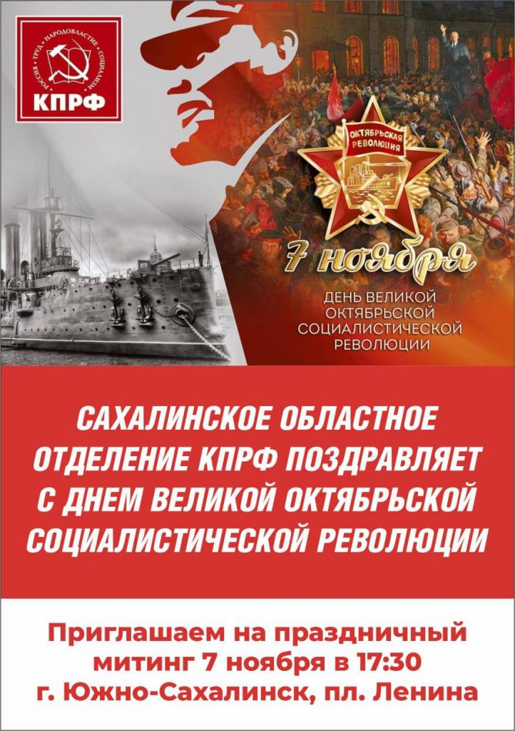 От имени Сахалинского областного комитета КПРФ и от себя лично горячо поздравляю вас с 108-й годовщиной Великой Октябрьской социалистической революции!