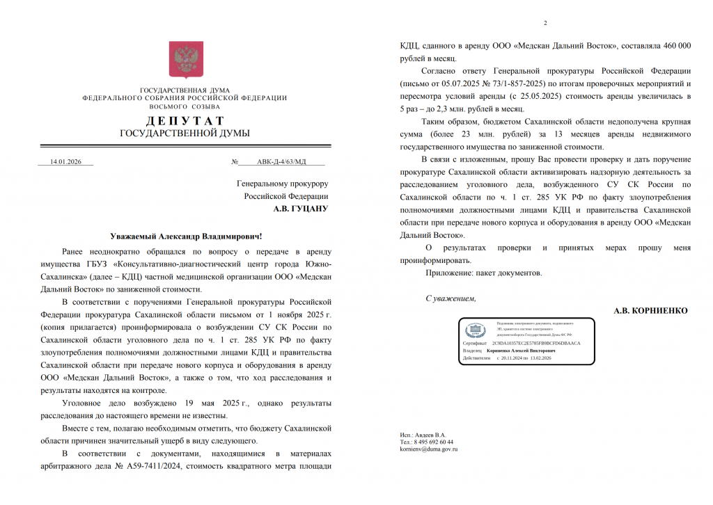 По уголовному делу, связанному с передачей нового корпуса и оборудования КДЦ в аренду “Медскану”, депутат Госдумы от КПРФ Алексей Корниенко 14 января 2026 года направил запросы Генеральному прокурору Российской Федерации и Председателю Следственного комитета Российской Федерации с просьбой активизировать надзор и расследование.