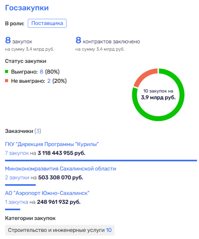 – 3,1 миллиарда рублей (7 закупок) поступило от ГКУ «Дирекция Программы “Курилы”»;