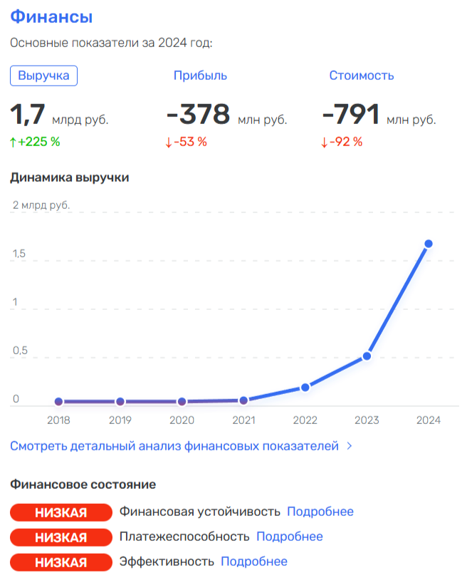 Финансовое состояние компании эксперты оценивают как низкое по всем ключевым параметрам: финансовая устойчивость, платежеспособность и эффективность находятся на критически низком уровне.