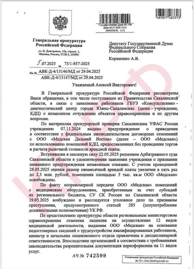 В ответ на депутатские запросы прокуратура Сахалинской области провела проверку и выявила нарушения, вынеся представления председателю правительства Сахалинской области. С молчаливого согласия Министерства земельных и имущественных отношений и регионального Минздрава новый корпус КДЦ был сдан в аренду без конкурсных процедур.