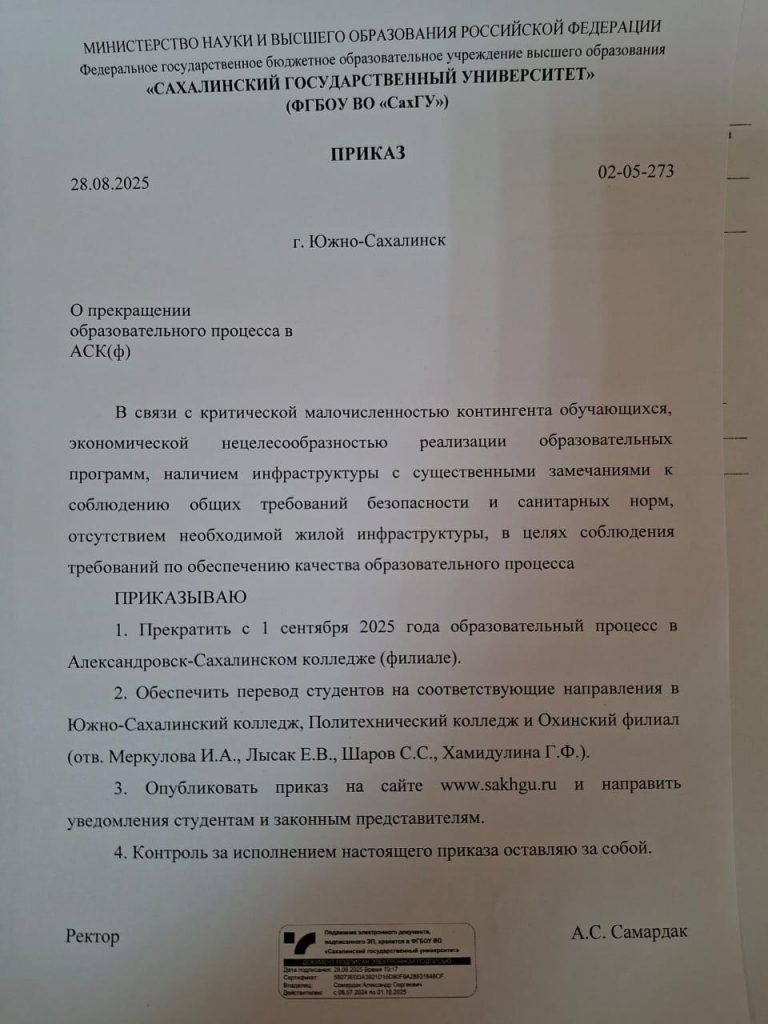 Примечательно, что ранее прокуратура уже настаивала на ремонте помещений, но эти требования руководством СахГУ были проигнорированы. Теперь же именно спорная экспертиза стала главным аргументом для закрытия. О приказе, стоившем Самардаку кресла ректора и вынудившем студентов покинуть родной район, уже не вспоминают.
