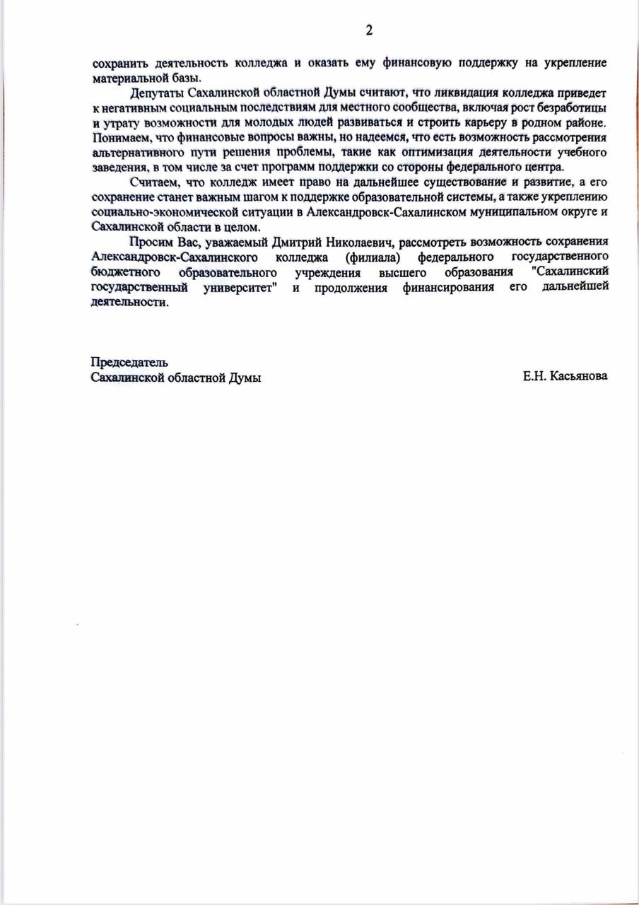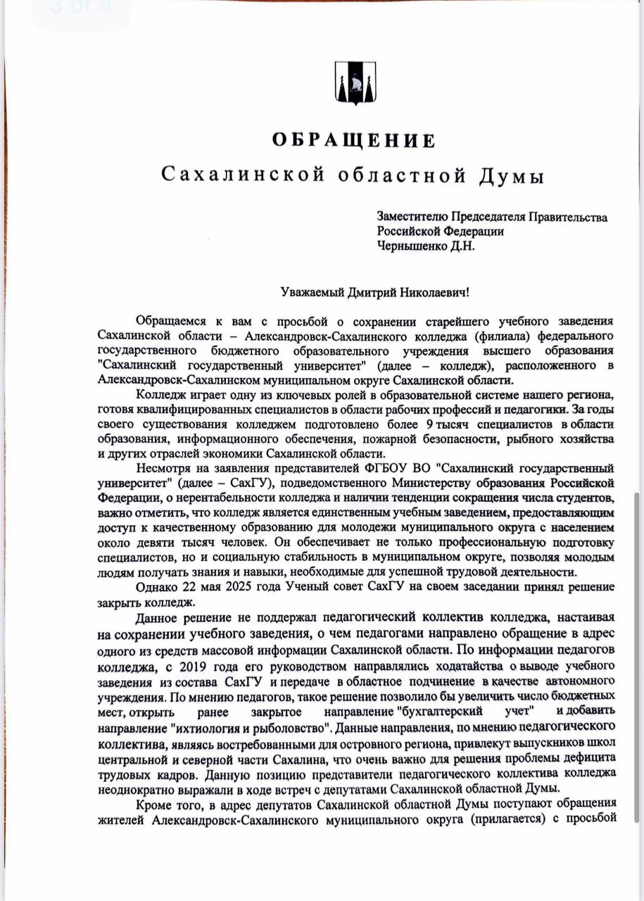 Мы продолжаем обращаться к властям всех уровней с требованием сохранить колледж. Уверены, наши обращения были бы весомее при поддержке коллег-парламентариев, всей Сахалинской областной Думы! Напомню, еще в июне 2025 года мы внесли вопрос о сохранении колледжа в повестку, но до сих пор он не рассмотрен даже в профильном комитете, который, кстати, возглавляет депутат «Единой России» от Александровска-Сахалинского Александр Болотников».